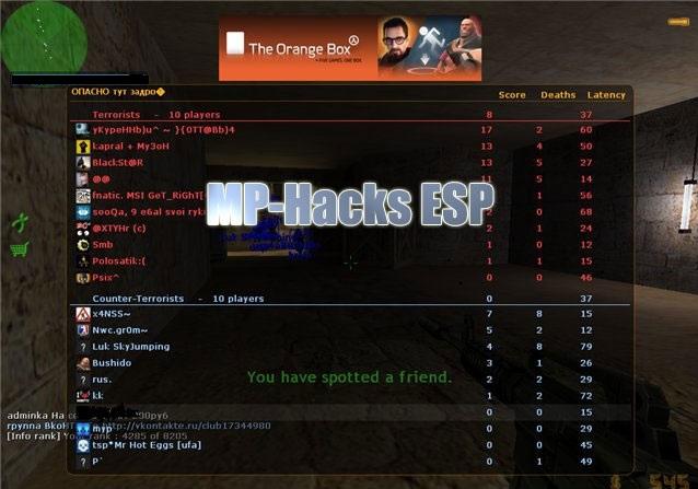 Идеальный чит, если нет желания спалится) Очень наовороченый ESP Multi Функции - PANIC button in menu - ESP - Name (min 0, max 32) - Box - LineWidth - Trans - Fixed/Autosize - Distance - Weapon - Health (DoD only) - Sound - FarESP - Sound Timeout - Barrel (min 0, max 100) - Glow (OpenGL only) - Chams (2 styles, OpenGL only) - CollisionBox - Entity - Grenade - Misc - 2 Crosshairs - Bunnyhop - viewmodelglow (3 styles) - Sizeable - Colorizeable - Radar (CS/CZ only) - NoHands (2 styles, CS only) - NoFlash (2 styles, CS/CZ only) - Wallglow - Fullbright (CS/CZ/DoD/NS only) - Cvars - Load/Save - 2 Different configs - Menu - Moveable with Mouse - Colorizeable